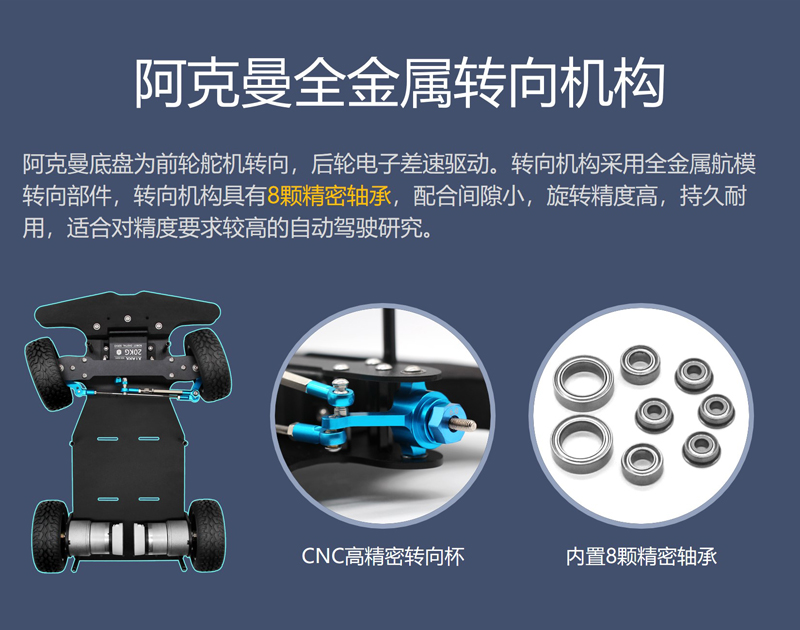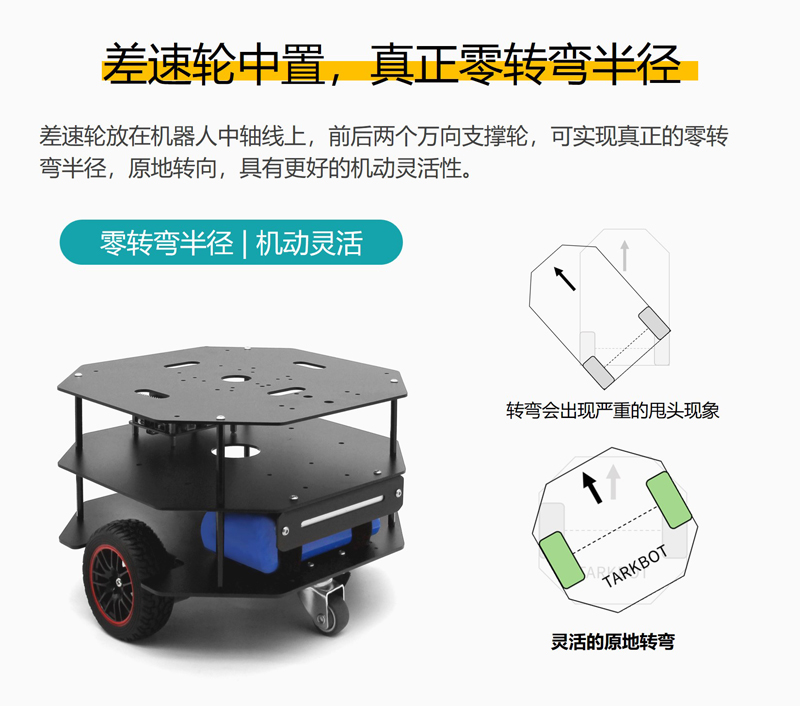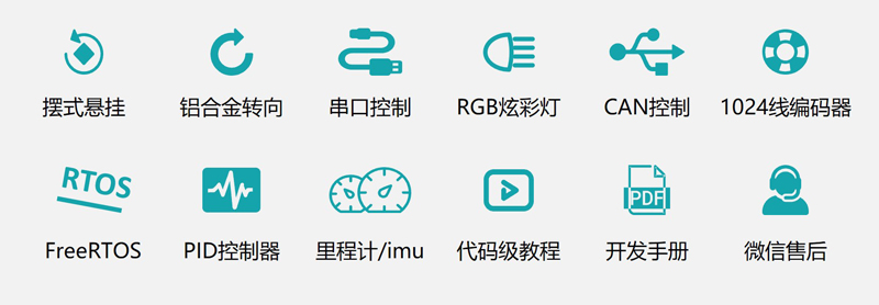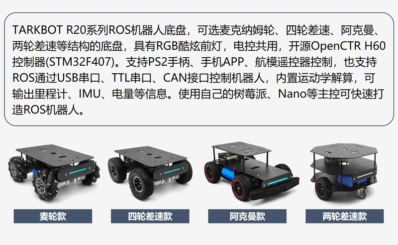 產品簡介:TARKBOT R20系列ROS機器人底盤,可選麥克納姆輪、四輪差速、阿克曼、兩輪差速等結構的底盤,具有RGB酷炫前燈,電控共用,開源OpenCTR H60控制器(STM32F407)。支持PS2手柄、手機APP、航模遙控器控制,也支持ROS通過USB串口、TTL串口、CAN接口控制機器人,內置運動學解算,可輸出里程計、IMU、電量等信息。使用自己的樹莓派、Nano等主控可快速打造ROS機器人。
