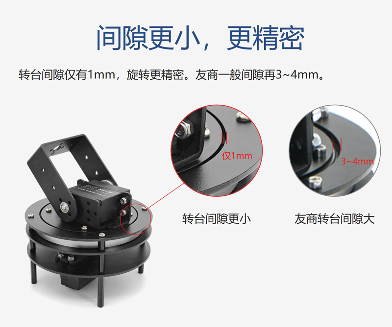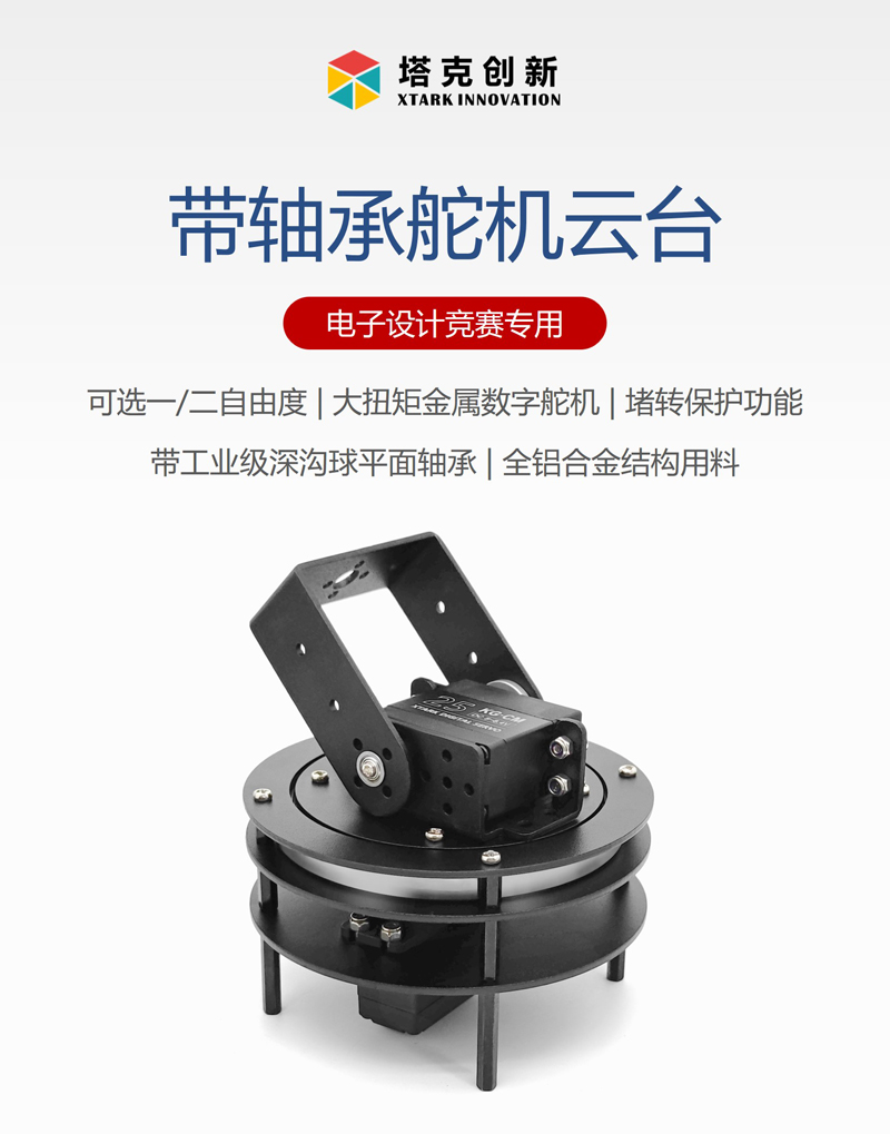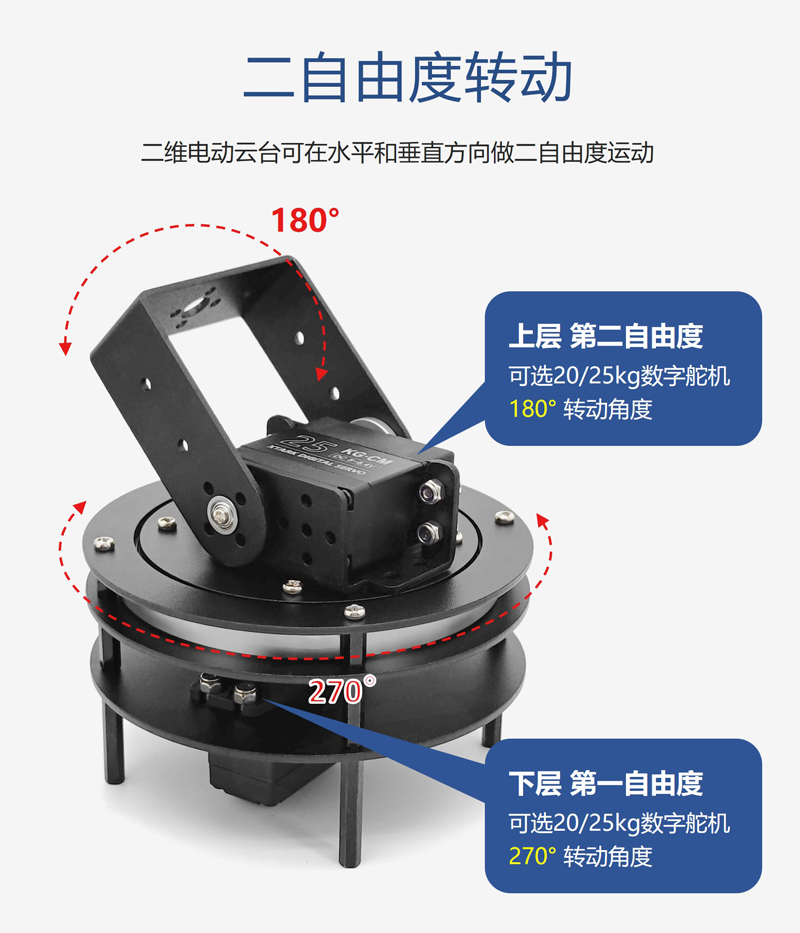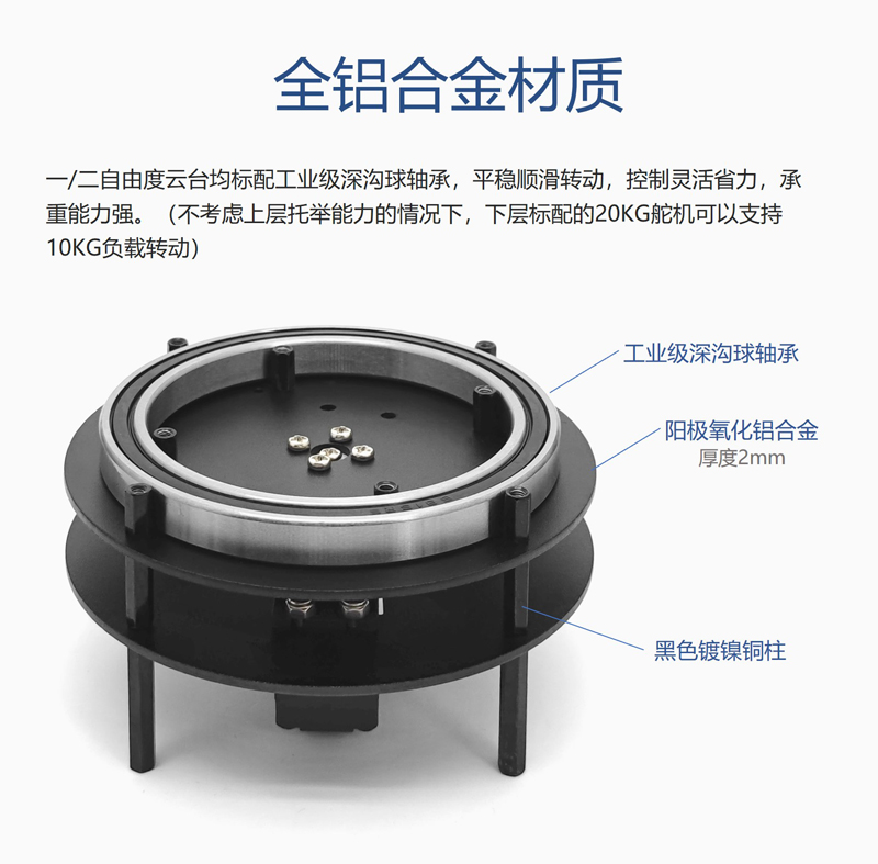 產品簡介:帶軸承舵機云臺可選一/二自由度,可在水平和垂直方向做二自由度運動;可選20/25KG大扭矩金屬數字舵機,全金屬輸出軸,一體式金屬齒輪結構,堵轉防燒;帶工業級深溝球平面軸承,平穩順滑轉動,控制靈活省力,承重力強;全鋁合金結構用料,轉臺間隙更小,旋轉更精密。