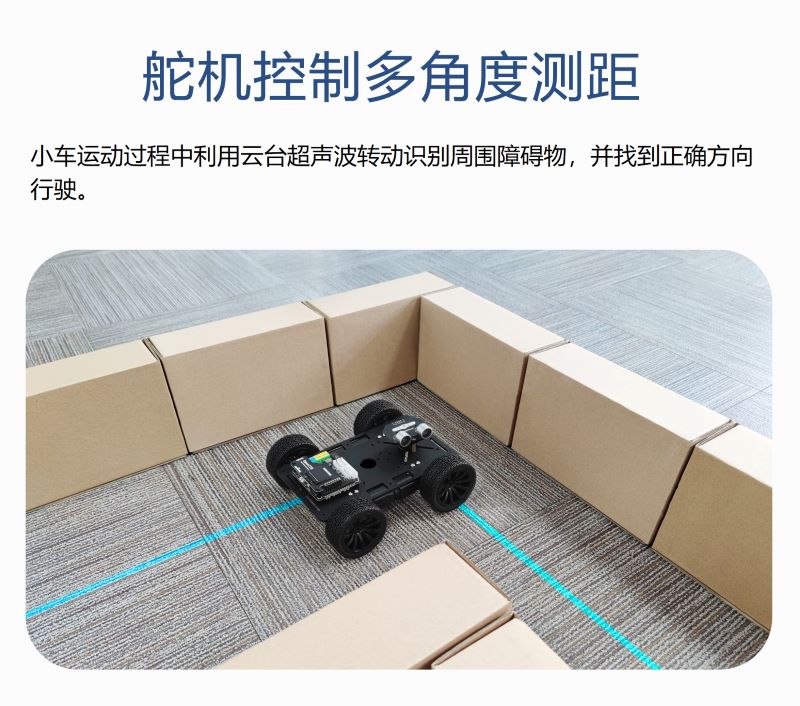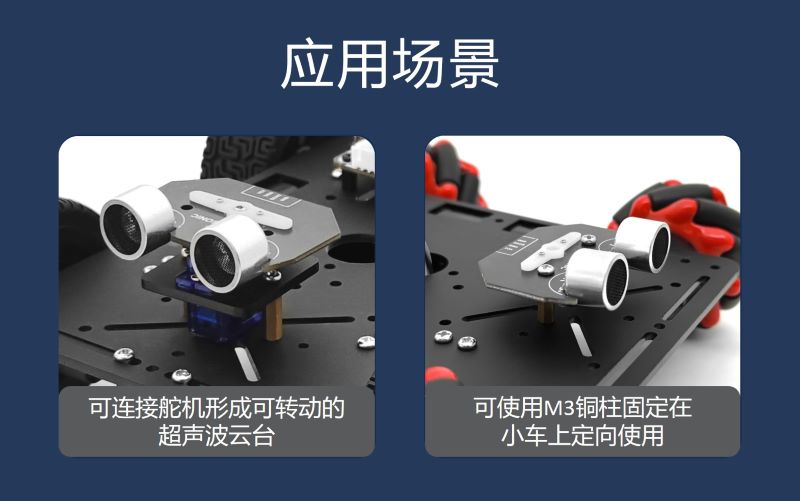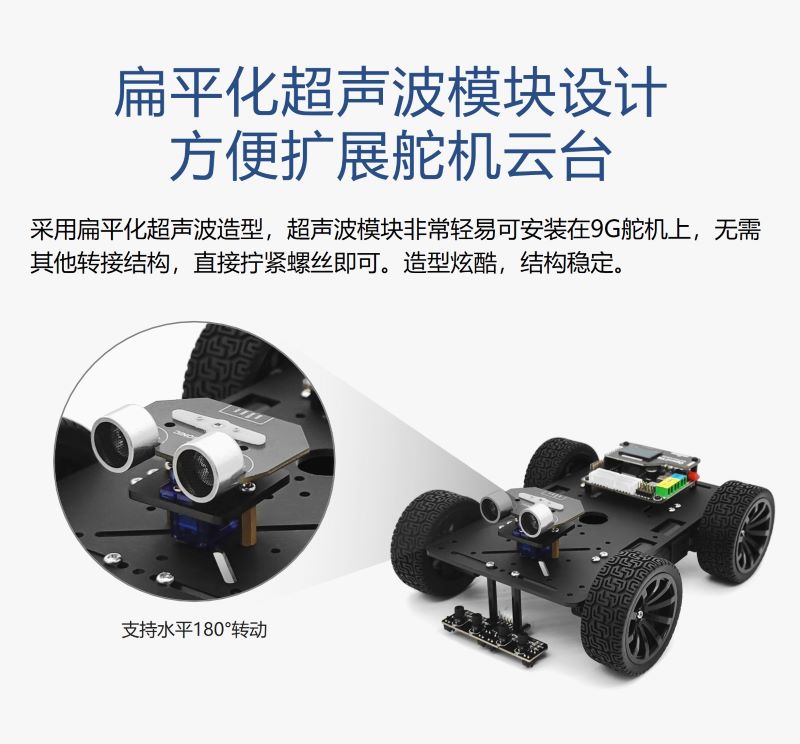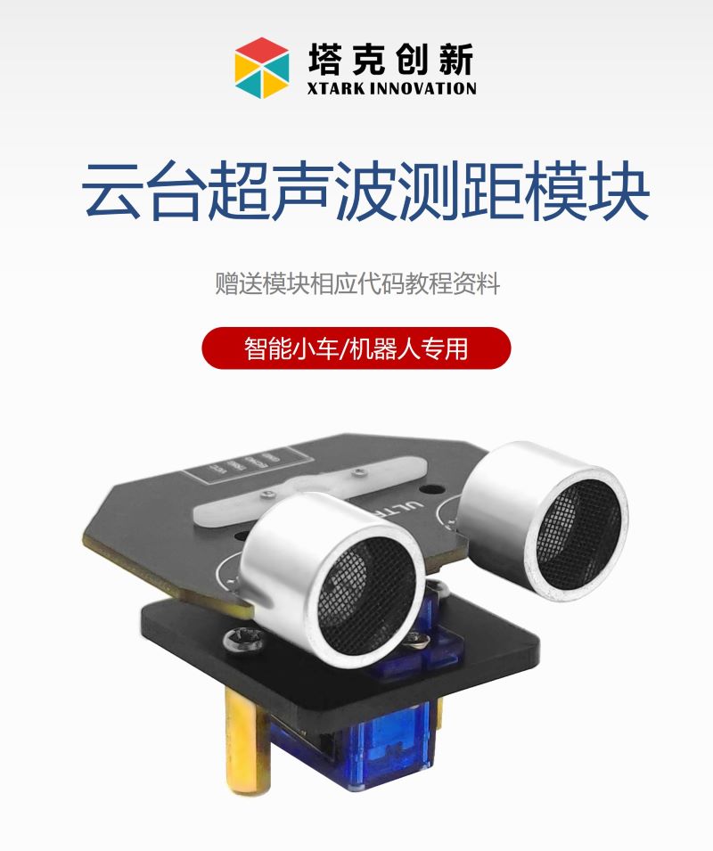 產品簡介:云臺超聲波測距模塊采用扁平化超聲波造型,超聲波模塊非常輕易可安裝在9G舵機上,無需其他轉接結構,直接擰緊螺絲即可,造型炫酷,結構穩定;小車運動過程中可以利用云臺超聲波轉動識別周圍障礙物,并找到正確方向行駛;提供豐富開發資料,智能小車、機器人專用模塊。