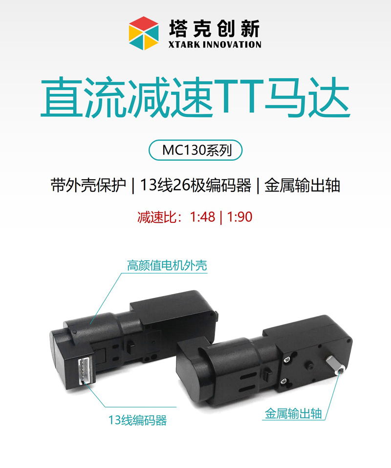 產(chǎn)品簡介:直流減速TT馬達帶外殼保護,顏值高;13線26極編碼器,精度高,多減速比可選;金屬輸出軸,品質(zhì)高耐用,可適配多款智能小車底盤。