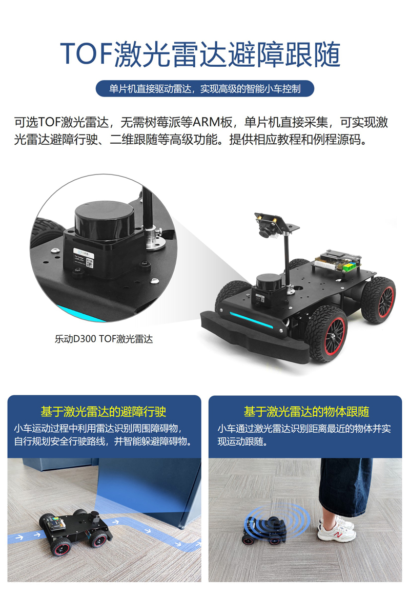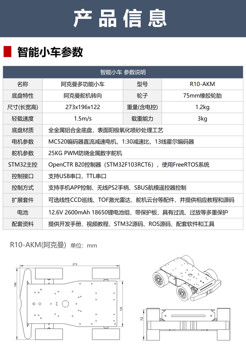產品簡介:TARKBOT R10系列阿克曼舵機轉向小車是塔克創新面向大學生電子設計競賽/DIY小車/學科實訓教學場景開發的多功能智能小車。搭載520大功率高精度霍爾編碼器減速電機,25KG金屬高速數字舵機,全金屬底盤,負載可達3kg,適合各類小車賽事。主控采用STM32F103RCT6,支持2路編碼器電機PID速度閉環控制,6路PWM舵機,內置IMU加速度陀螺儀,支持PS2手柄、藍牙APP、航模遙控器控制,可選CCD巡線模塊、TOF雷達避障跟隨、舵機云臺等豐富配件。支持ROS擴展,可通過USB串口、TTL串口控制,內置開源運動學解算,可輸出里程計、IMU、電量等信息。使用自己的樹莓派、旭日X3等主控可快速制作ROS機器人。提供視頻教程和源碼,支持二次開發。