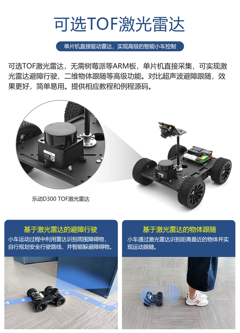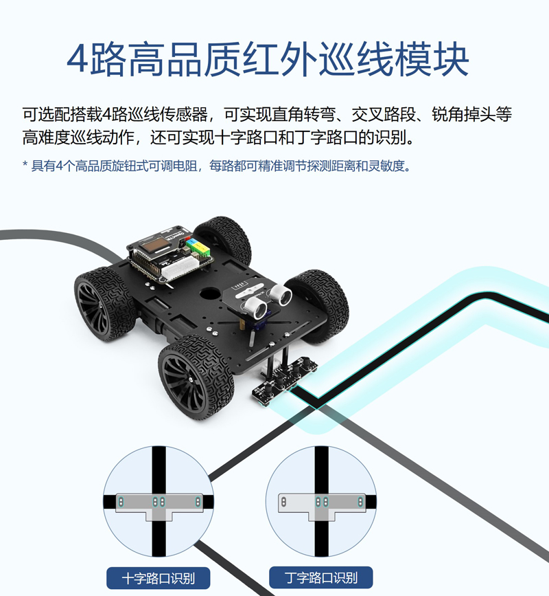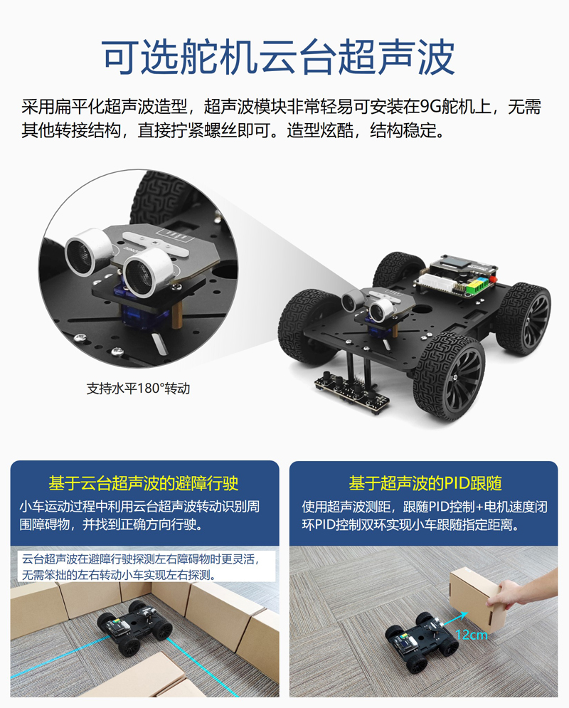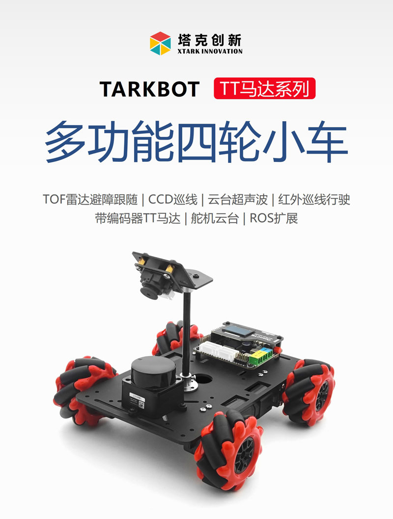 產(chǎn)品簡(jiǎn)介:TARKBOT TT馬達(dá)系列小車是塔克創(chuàng)新面向大學(xué)生電子設(shè)計(jì)競(jìng)賽/DIY小車/學(xué)科實(shí)訓(xùn)教學(xué)場(chǎng)景開發(fā)的多功能智能小車。搭載帶編碼器金屬軸TT馬達(dá),外觀小巧精致,適合各類小車賽事。主控采用STM32F407VET6,支持4路編碼器電機(jī)PID速度閉環(huán)控制,6路PWM舵機(jī),內(nèi)置IMU加速度陀螺儀。支持PS2手柄、手機(jī)藍(lán)牙APP、航模遙控器控制,可選4路紅外巡線模塊、CCD巡線模塊、云臺(tái)超聲波避障、TOF雷達(dá)避障跟隨、舵機(jī)云臺(tái)等豐富配件。支持ROS擴(kuò)展,可通過USB串口、TTL串口、CAN接口控制,內(nèi)置開源運(yùn)動(dòng)學(xué)解算,可輸出里程計(jì)、IMU、電量等信息。使用自己的樹莓派等主控可快速制作ROS機(jī)器人。提供視頻教程和源碼,支持二次開發(fā)。