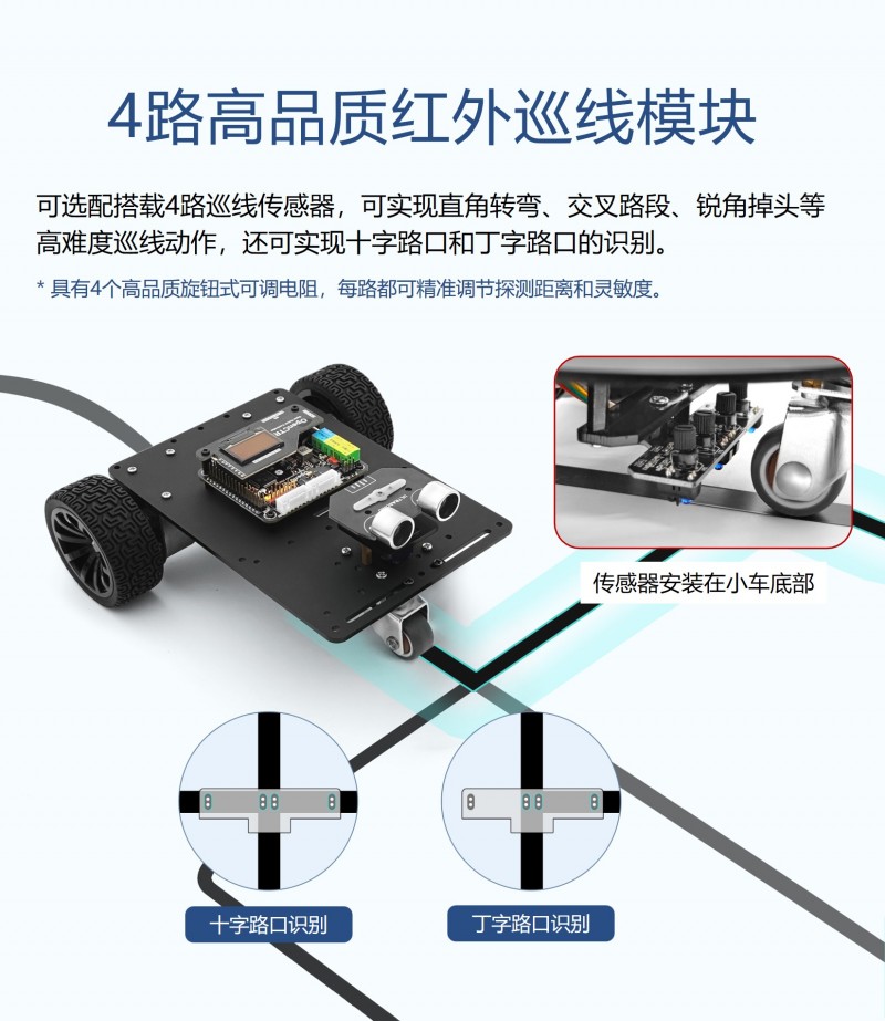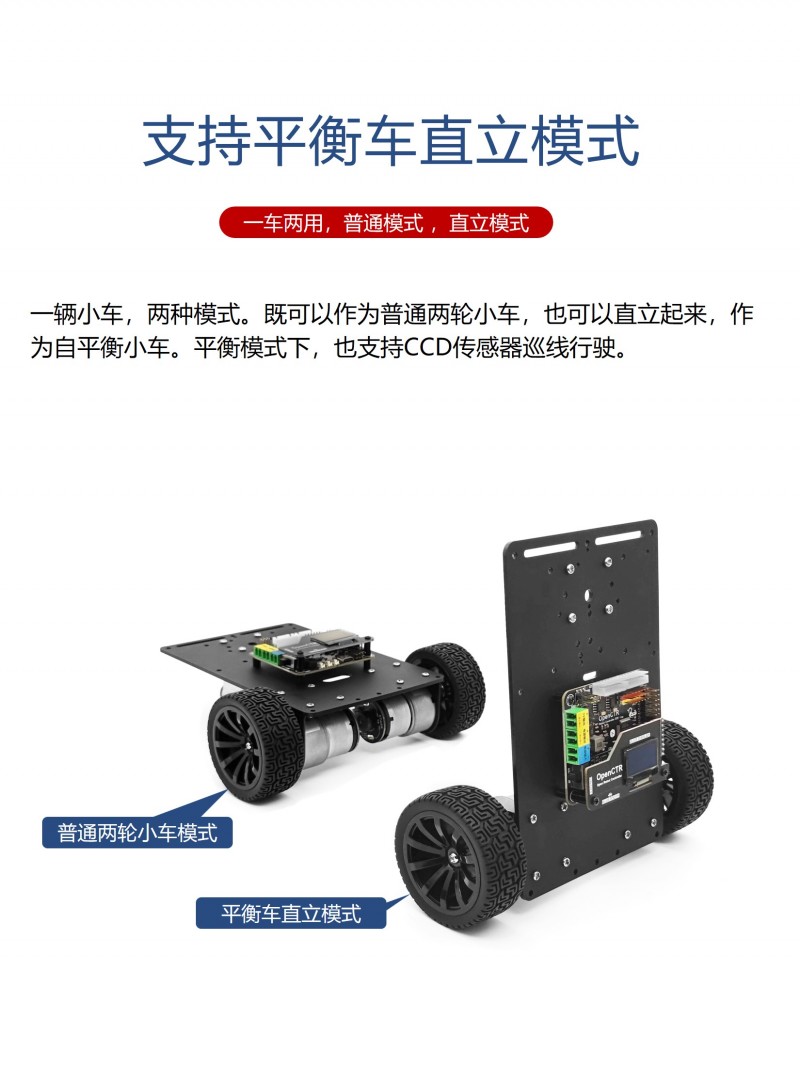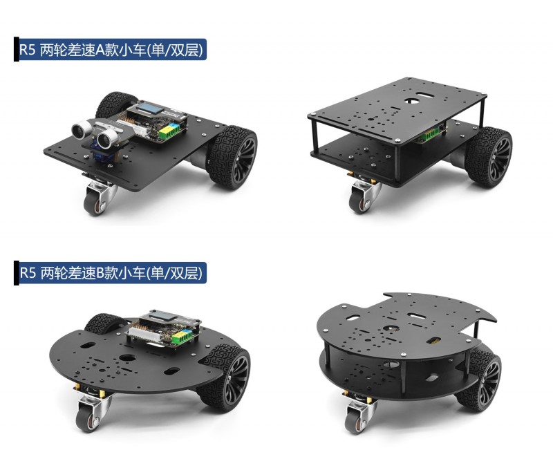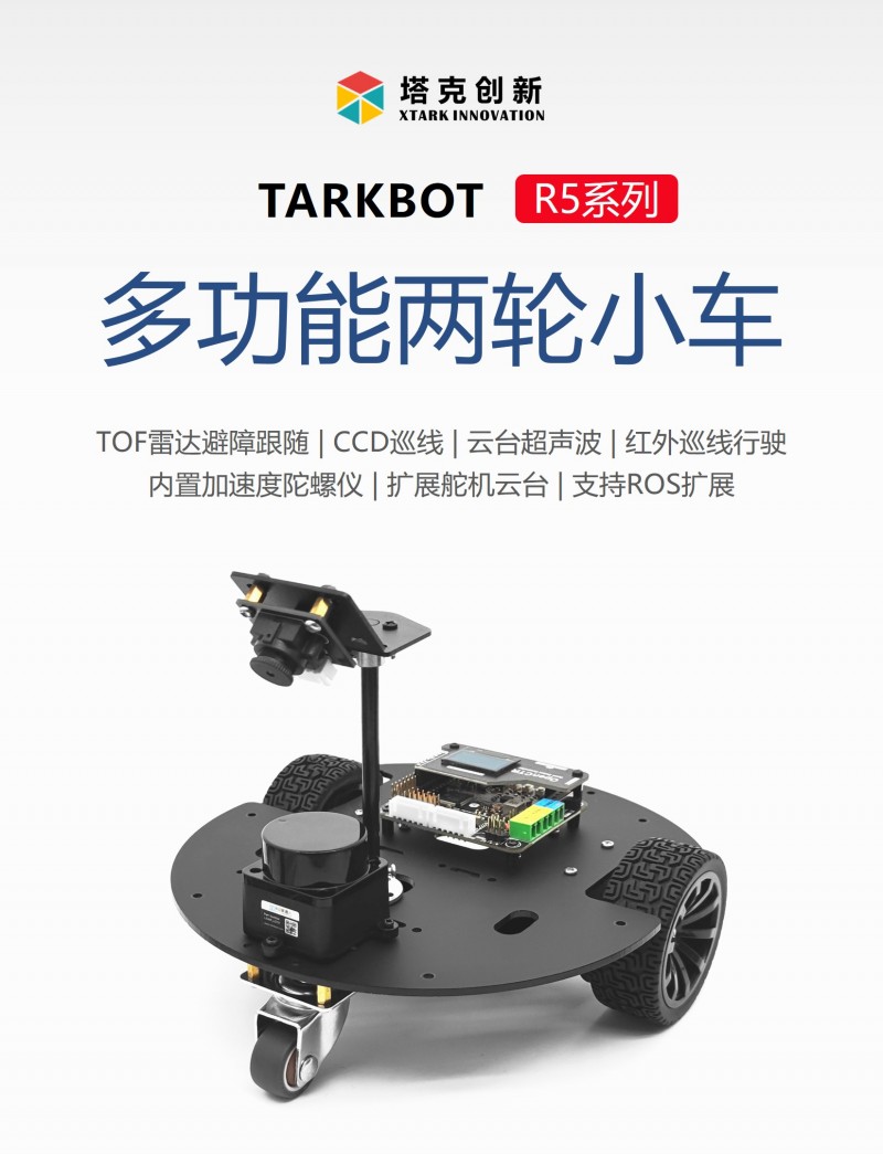 產(chǎn)品簡(jiǎn)介: TARKBOT R5系列兩輪小車是塔克創(chuàng)新面向大學(xué)生電子設(shè)計(jì)競(jìng)賽/DIY小車/學(xué)科實(shí)訓(xùn)教學(xué)場(chǎng)景開發(fā)的多功能智能小車。主控采用STM32F103RCT6,內(nèi)置IMU加速度陀螺儀傳感器,搭載520大功率霍爾編碼器電機(jī)。小車支持PS2手柄、手機(jī)藍(lán)牙APP、航模遙控器控制,可選四路紅外巡線模塊、CCD巡線模塊、云臺(tái)超聲波避障、TOF雷達(dá)避障跟隨、舵機(jī)云臺(tái)等豐富配件。支持ROS擴(kuò)展,可通過USB串口、TTL串口控制,提供視頻教程和源碼,支持二次開發(fā),特別適合各類小車賽事。