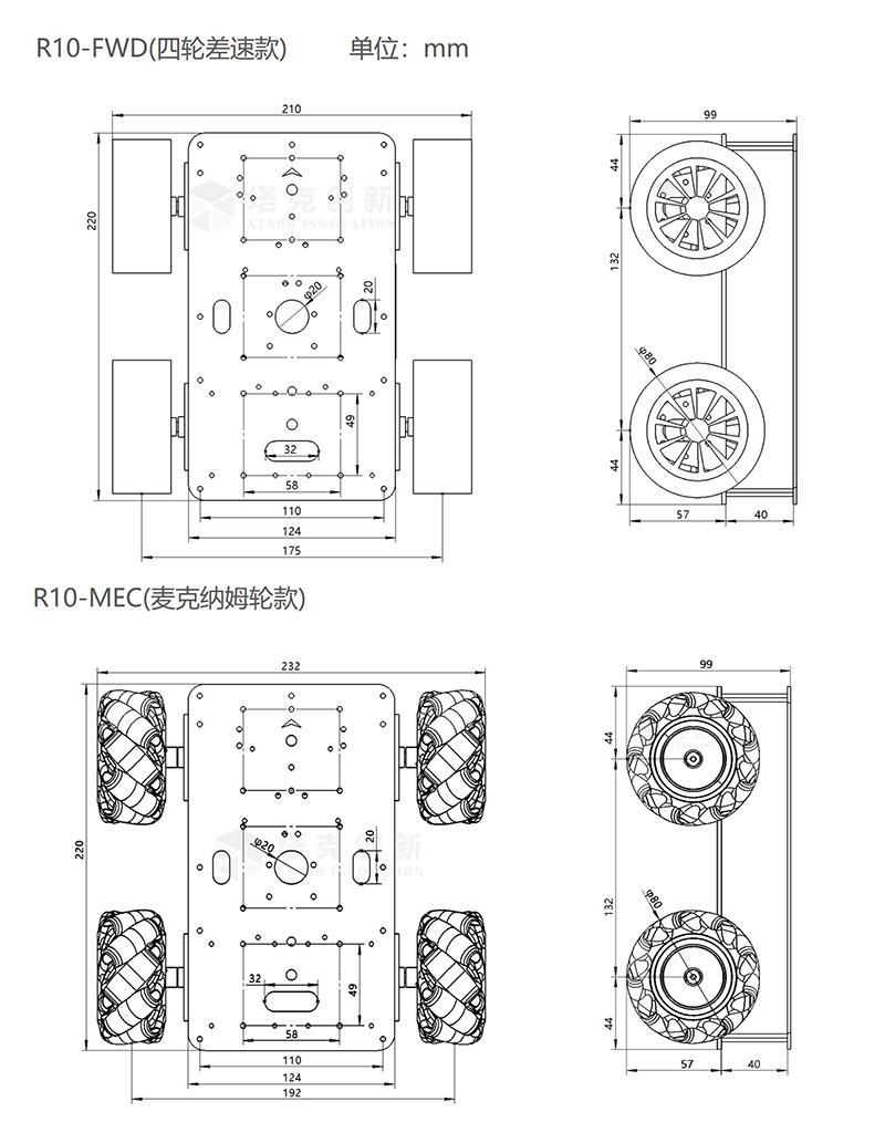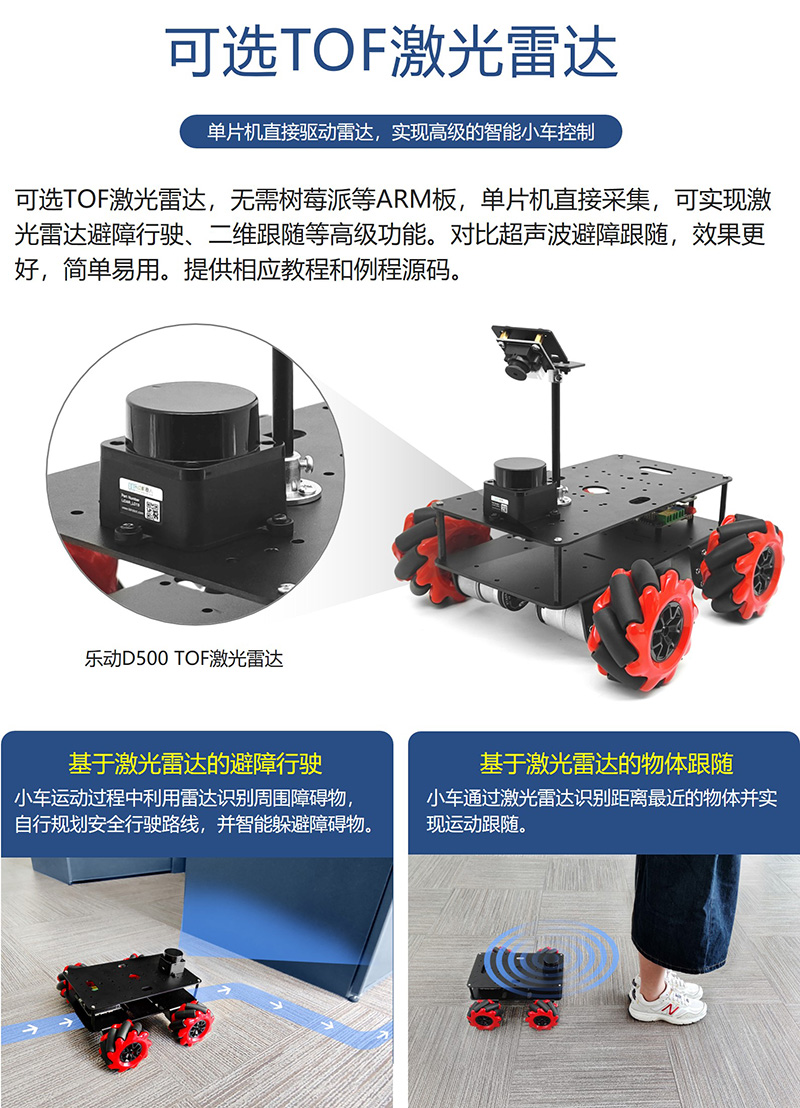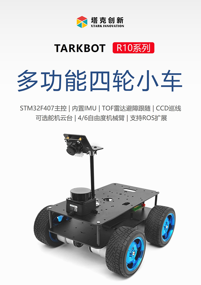 產(chǎn)品簡介:TARKBOT R10系列四輪/麥輪小車是塔克創(chuàng)新面向大學(xué)生電子設(shè)計(jì)競賽/DIY小車/學(xué)科實(shí)訓(xùn)教學(xué)場景開發(fā)的多功能智能小車。搭載520大功率高精度霍爾編碼器減速電機(jī),全金屬底盤,負(fù)載可達(dá)5kg,適合各類小車賽事。 主控采用STM32F407VET6,支持4路編碼器電機(jī)PID速度閉環(huán)控制,6路PWM舵機(jī),內(nèi)置IMU加速度陀螺儀。小車支持PS2手柄、手機(jī)藍(lán)牙APP、航模遙控器控制,可選CCD巡線模塊、TOF雷達(dá)避障跟隨、舵機(jī)云臺、機(jī)械臂等豐富配件。支持ROS擴(kuò)展,可通過USB串口、TTL串口、CAN接口控制,內(nèi)置開源運(yùn)動學(xué)解算,可輸出里程計(jì)、IMU、電量等信息。使用自己的樹莓派、Nano等主控可快速制作ROS機(jī)器人。提供視頻教程和源碼,支持二次開發(fā)。