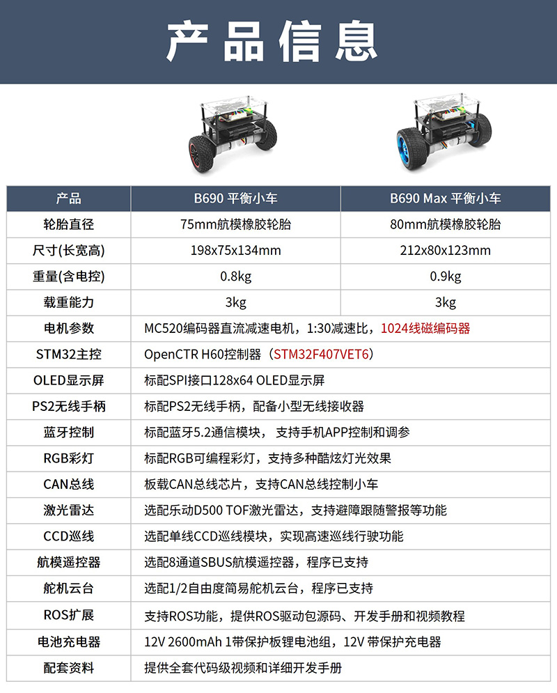 產品簡介:TARKBOT B690系列平衡小車采用一體化金屬底盤設計,520大功率編碼器電機,負載可達3KG。采用驅控一體式控制器OpenCTR H60(STM32F407VET6) ,小巧緊湊,內置IMU加速度陀螺儀傳感器,具有酷炫RGB編程彩燈。小車支持PS2無線手柄、藍牙APP控制、航模遙控器控制,支持CAN總線控制,支持STM32直接連接激光雷達實現避障跟隨功能,支持CCD高速巡線功能,可擴展舵機云臺。提供專業串口波形調試軟件,方便PID調試。小車支持通過USB串口進行ROS擴展。使用自己的樹莓派等主控可快速制作ROS自平衡機器人。提供ROS驅動包源碼、開發手冊和視頻教程,方便二次開發。