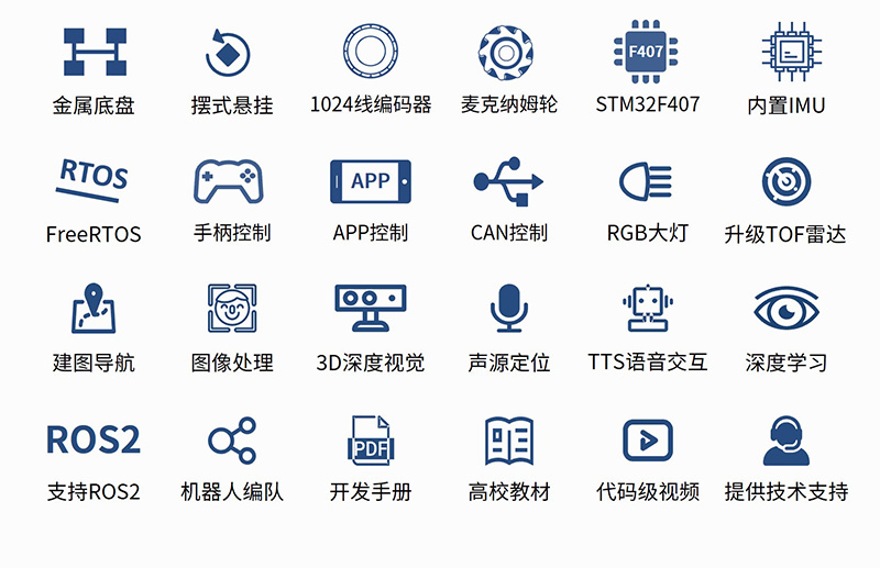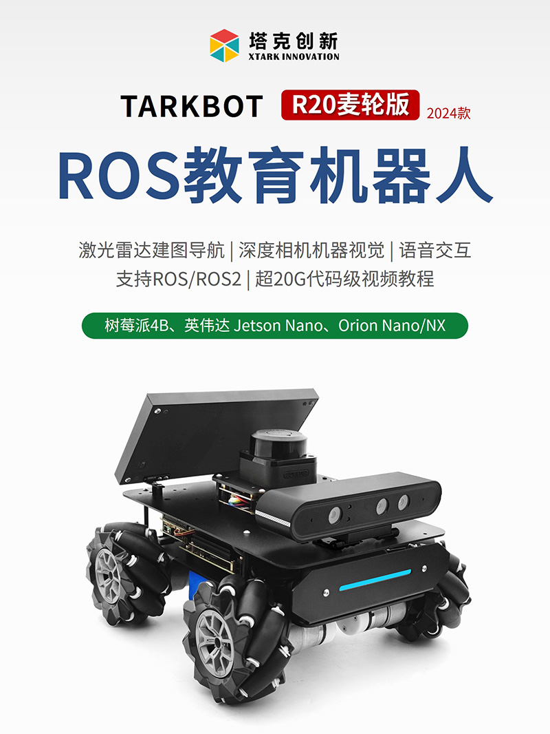產(chǎn)品簡介:塔克創(chuàng)新TARKBOT R20系列是針對ROS教育科研的旗艦產(chǎn)品,支持主流的樹莓派4B、英偉達Jetson Nano、Orion Nano/NX系列主控,支持ROS1和ROS2系統(tǒng)。具有1024線高精度編碼器,STM32F407主控,酷炫可編程RGB彩燈,搭載奧比中光深度相機、激光雷達、語音交互配件。可實現(xiàn)機器人運動控制、SLAM建圖導航、機器視覺、3D視覺、語音控制、跟隨避障、多機器人編隊等功能,提供800+頁手冊和200+源碼級中英字幕視頻教程,提供技術(shù)支持,可零基礎(chǔ)入門和進階學習。