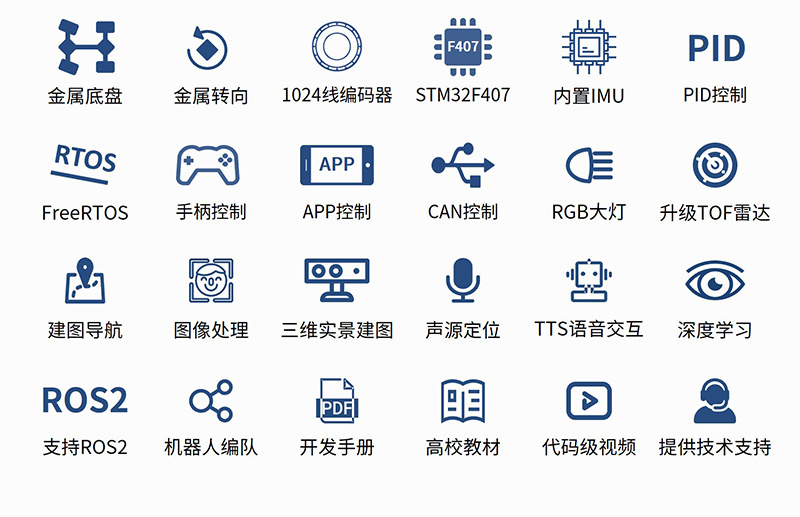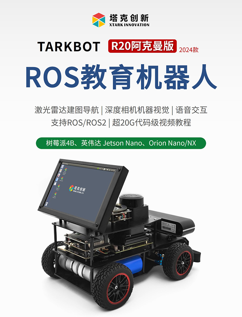 產(chǎn)品簡介:塔克創(chuàng)新TARKBOT R20系列是針對ROS教育科研的旗艦產(chǎn)品,支持主流的樹莓派4B、英偉達(dá)Jetson Nano、Orion Nano/NX系列主控,支持ROS1和ROS2系統(tǒng)。具有1024線高精度編碼器,STM32F407主控,酷炫可編程RGB彩燈,搭載奧比中光深度相機(jī)、激光雷達(dá)、語音交互配件。可實現(xiàn)機(jī)器人運(yùn)動控制、SLAM建圖導(dǎo)航、機(jī)器視覺、3D視覺、語音控制、跟隨避障、多機(jī)器人編隊等功能,提供800+頁手冊和200+源碼級中英字幕視頻教程,提供技術(shù)支持,可零基礎(chǔ)入門和進(jìn)階學(xué)習(xí)。