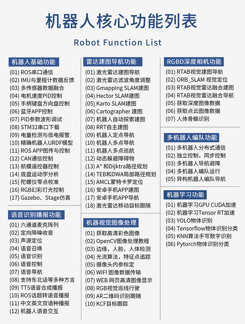 產(chǎn)品簡介:塔克創(chuàng)新TARKBOT R20系列是針對ROS教育科研的旗艦產(chǎn)品,支持主流的樹莓派4B、英偉達Jetson Nano、Orion Nano/NX系列主控,支持ROS1和ROS2系統(tǒng)。具有1024線高精度編碼器,STM32F407主控,酷炫可編程RGB彩燈,搭載奧比中光深度相機、激光雷達、語音交互配件。可實現(xiàn)機器人運動控制、SLAM建圖導(dǎo)航、機器視覺、3D視覺、語音控制、跟隨避障、多機器人編隊等功能,提供800+頁手冊和200+源碼級中英字幕視頻教程,提供技術(shù)支持,可零基礎(chǔ)入門和進階學(xué)習(xí)。