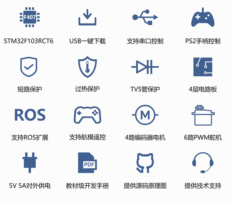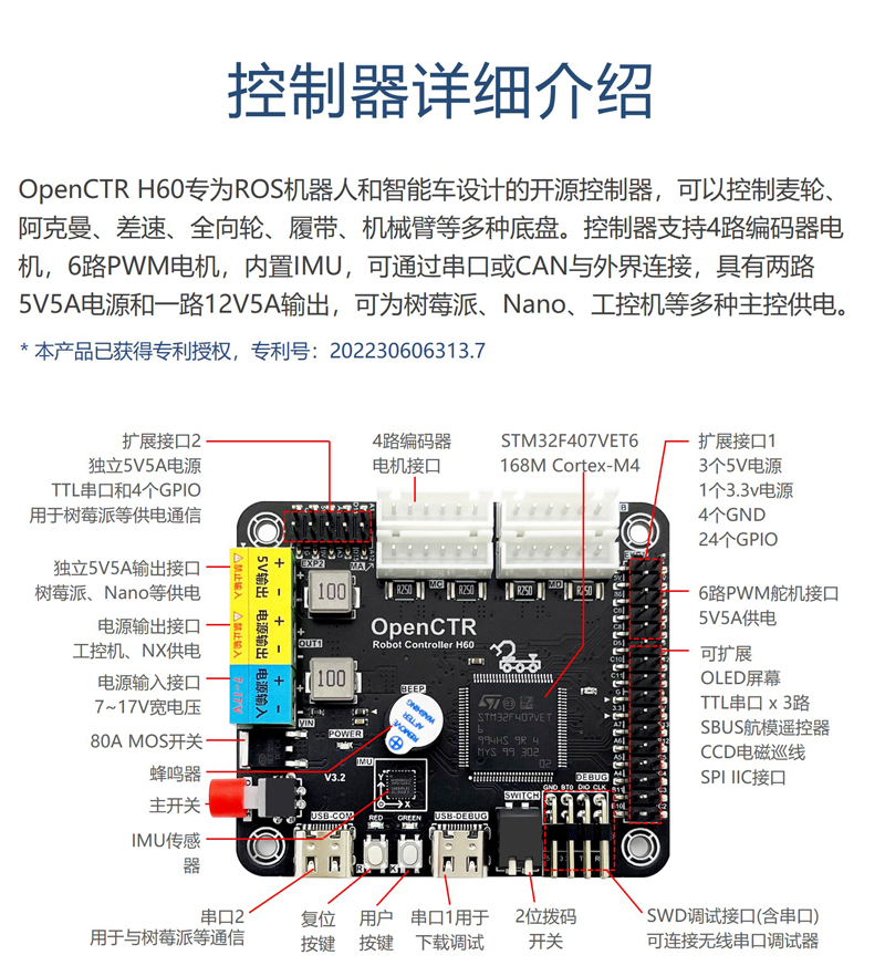 產(chǎn)品簡介:OpenCTR B20控制器具有2路編碼器電機(jī)接口,6路PWM接口,是一款專為兩輪差速、阿克曼、履帶底盤、平衡車設(shè)計(jì)的機(jī)器人控制器。其內(nèi)置IMU,可通過串口與外界連接,具有一路5V5A電源和一路12V5A輸出,可為樹莓派、魯班貓、旭日X3等主控供電。代碼和原理圖全部開源。